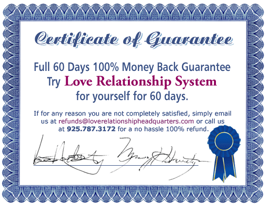 P.S. Here’s the bottom line: what’s your relationship worth? We promise you, if you order this material, give it a try, and it doesn’t work, we’ll return every penny you spent. Just call us on our 800 line or contact us at: refunds@loverelationshipheadquarters.com. This is a no risk shot at having the marriage you’ve always wanted.